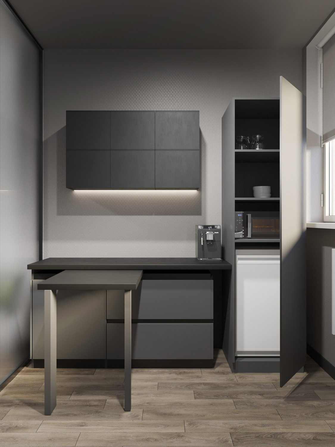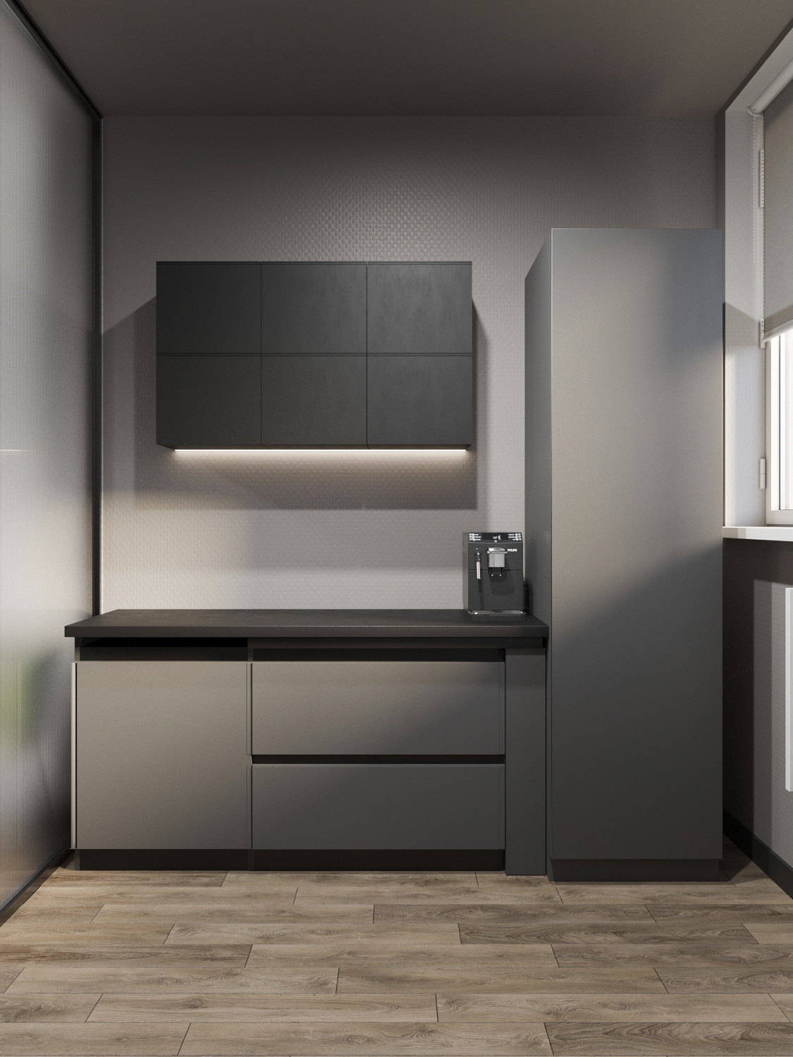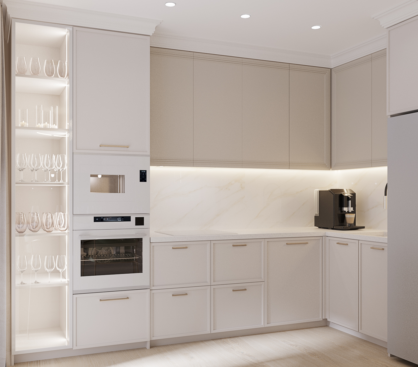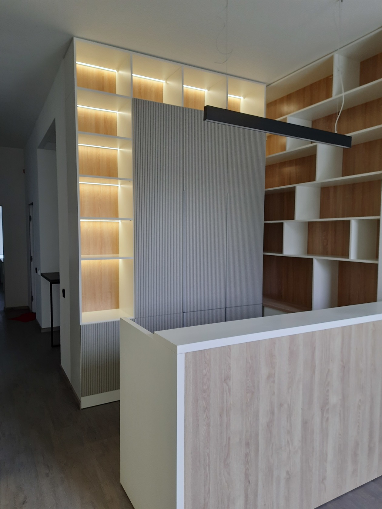 Использованные материалы: ЛДСП EGGER, крашеный фрезерованный МДФ, фурнитура Blum