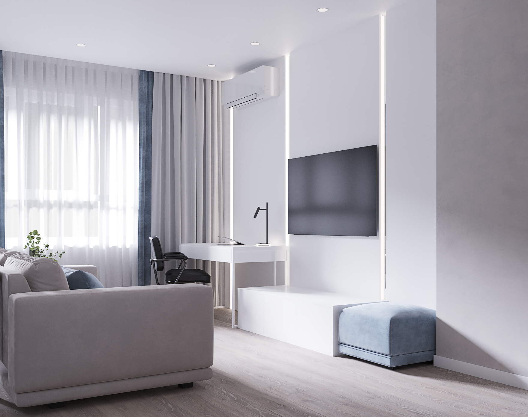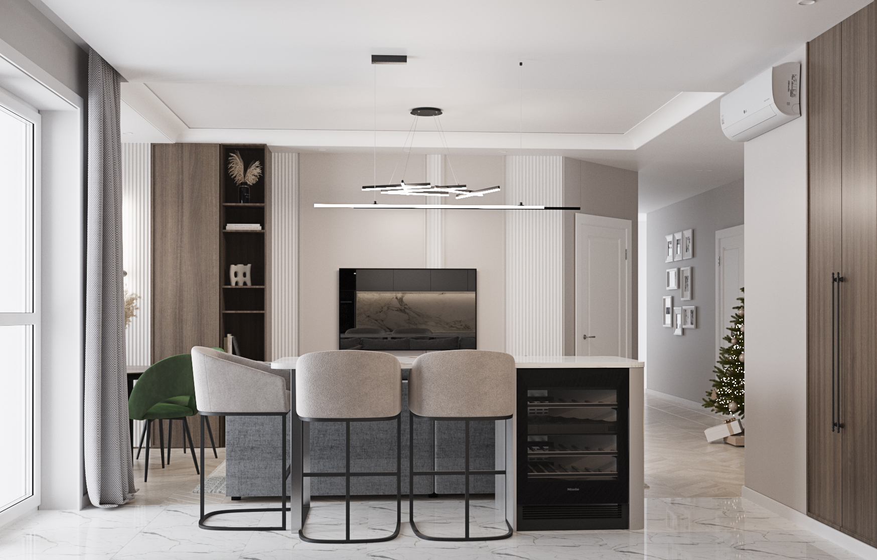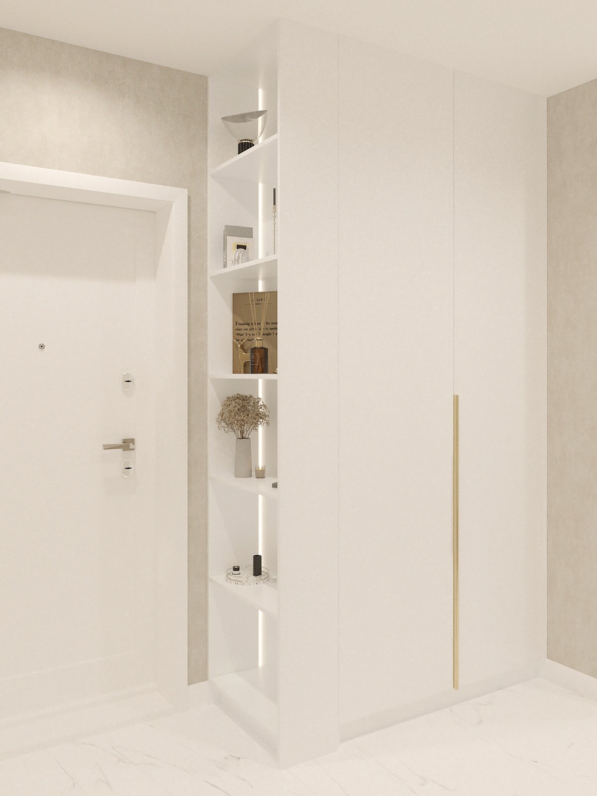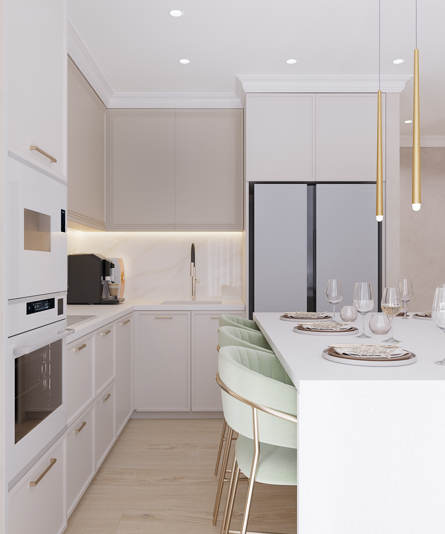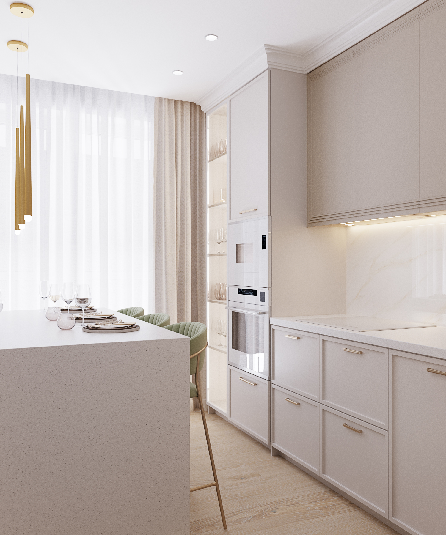Использованные материалы: ЛДСП EGGER, крашеный фрезерованный МДФ, фурнитура Blum