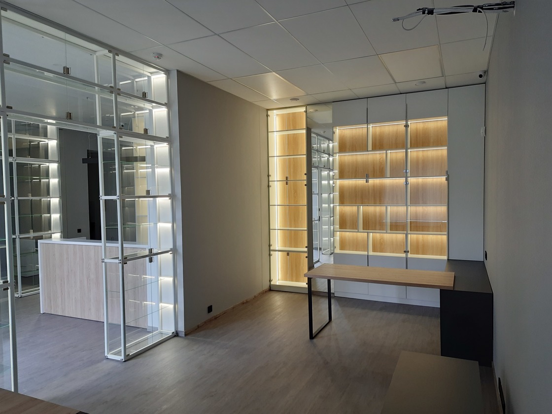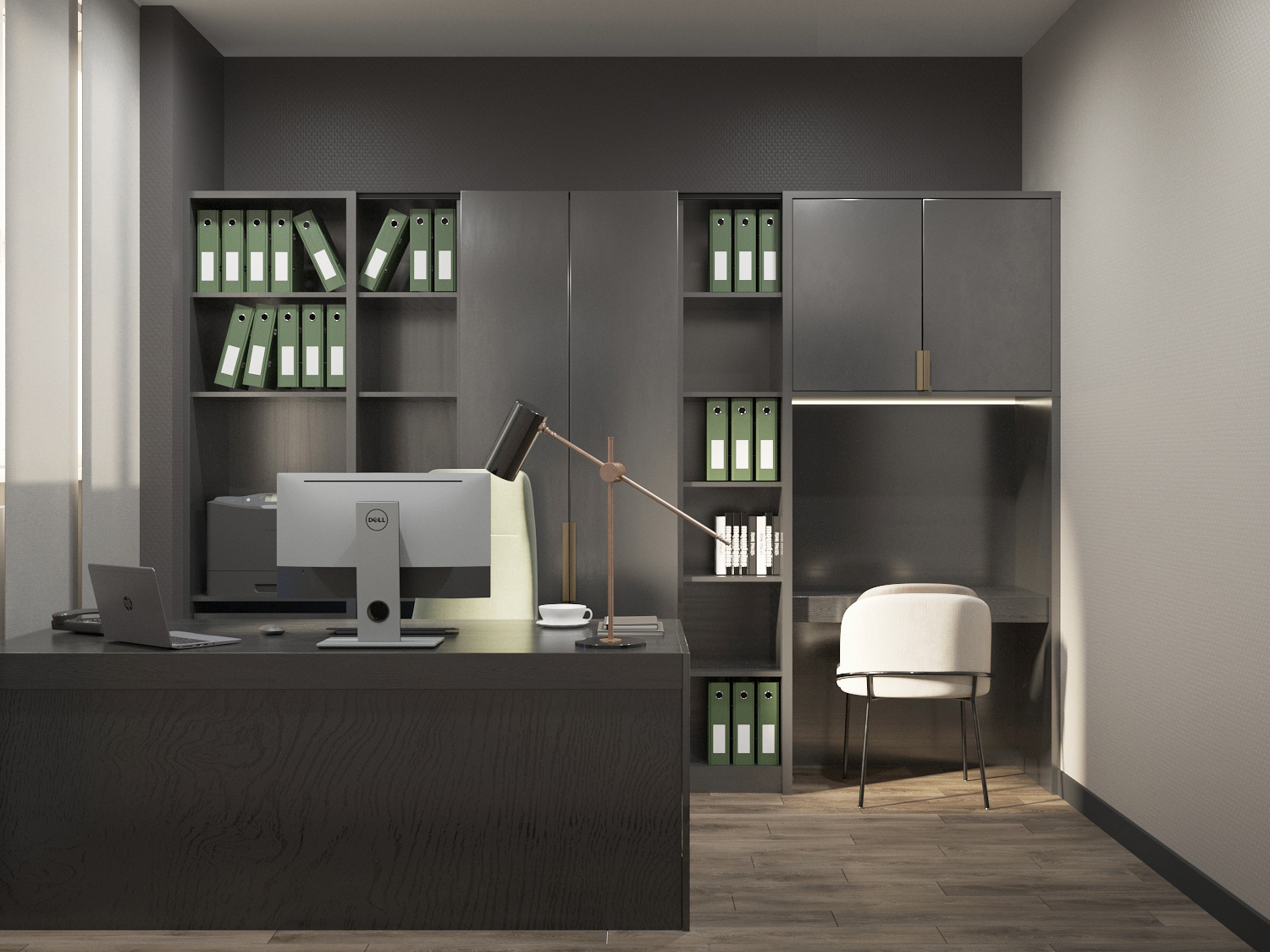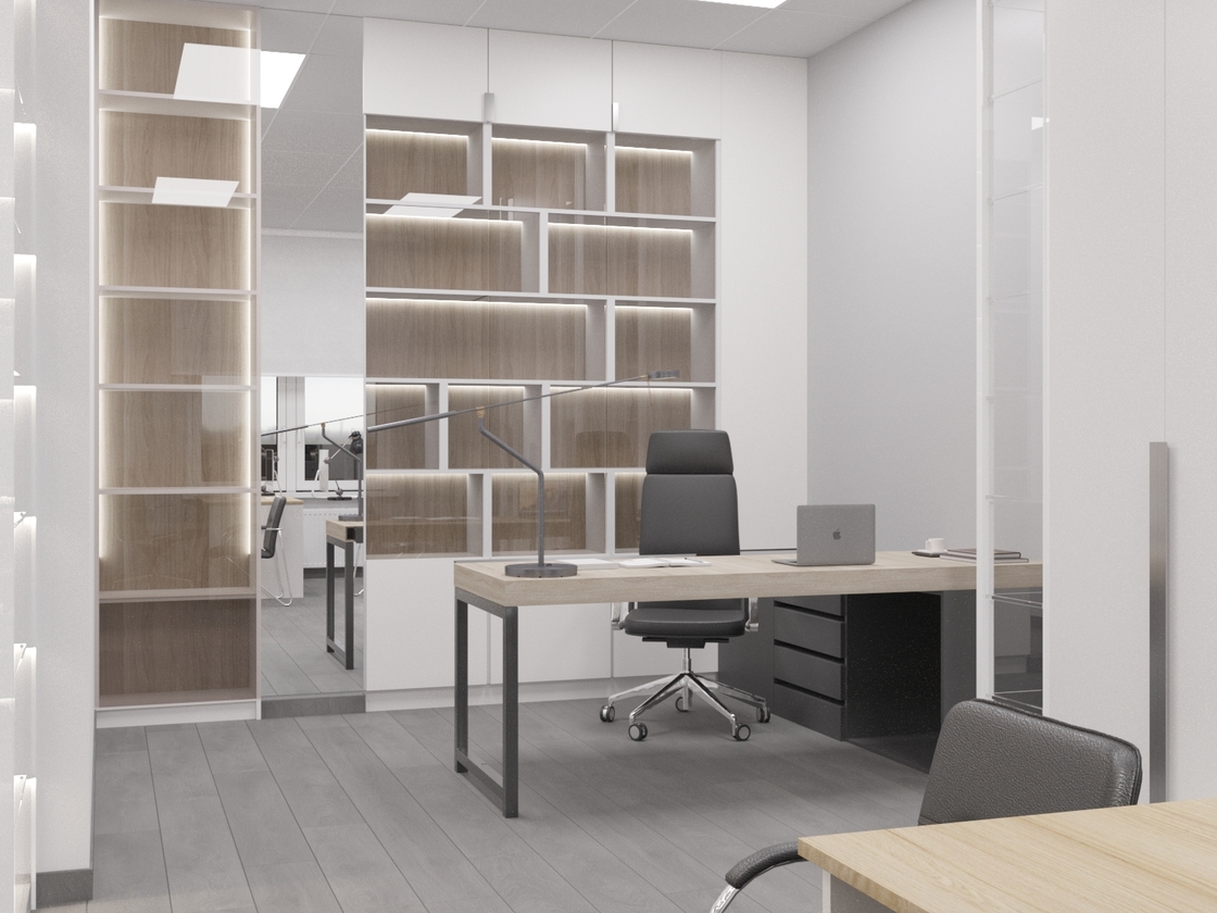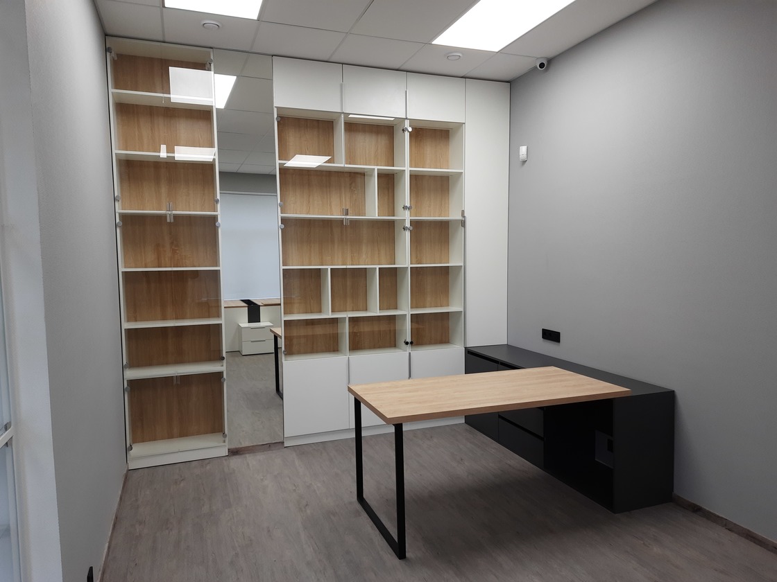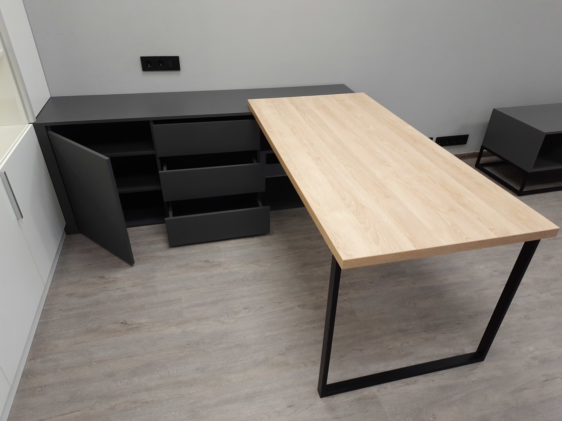 Использованные материалы: ЛДСП EGGER, сварные основания из металла с полимерной покраской, фурнитура Hettich